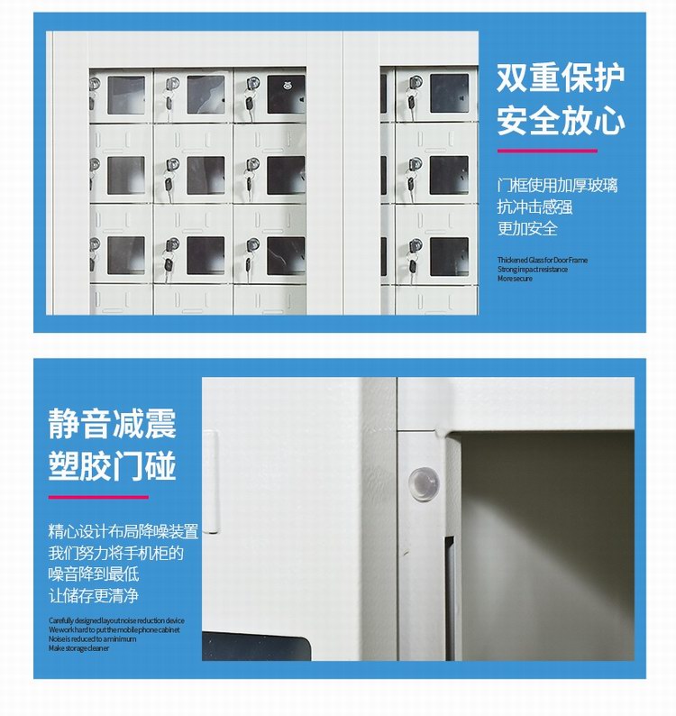 手機(jī)保密柜正面為對(duì)開金屬邊框玻璃大門,便于觀察柜內(nèi)情況,堅(jiān)固透亮,美觀大方。